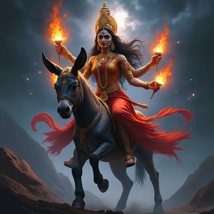 रात्रिदेवी (जिसे ‘देवी रात्रि’ या ‘रात की देवी’ के रूप में भी जाना जाता है) को बाद में कई देवियों के साथ जोड़ा गया, जिनमें दुर्गा(Durga) भी शामिल हैं, जो अथर्ववेद में प्रकट होती हैं। काला रंग सृष्टि से पहले मौजूद आदिम अंधकार को दर्शाता है।