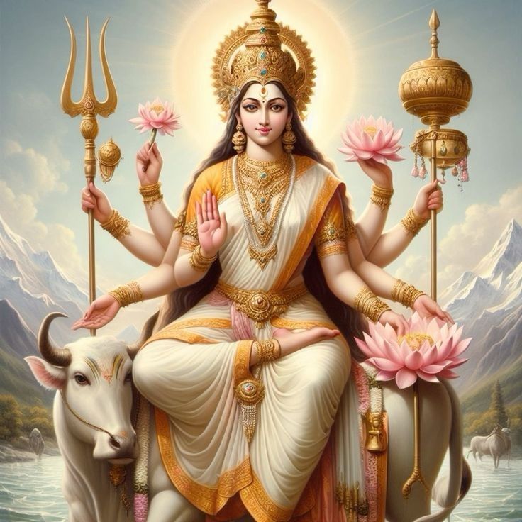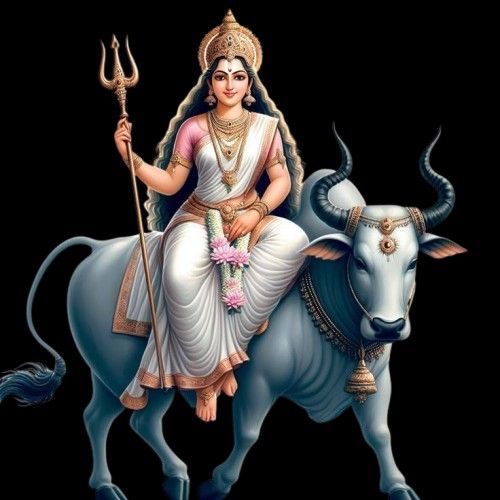 Parvati was commanded by Brahma to defeat the demons Shumbha and Nishumbha as well as to bathe in the Ganga River in the Himalayas. Following her bath, Parvati emerges from the river dressed in white, her skin glowing, and she is christened Mahagauri.